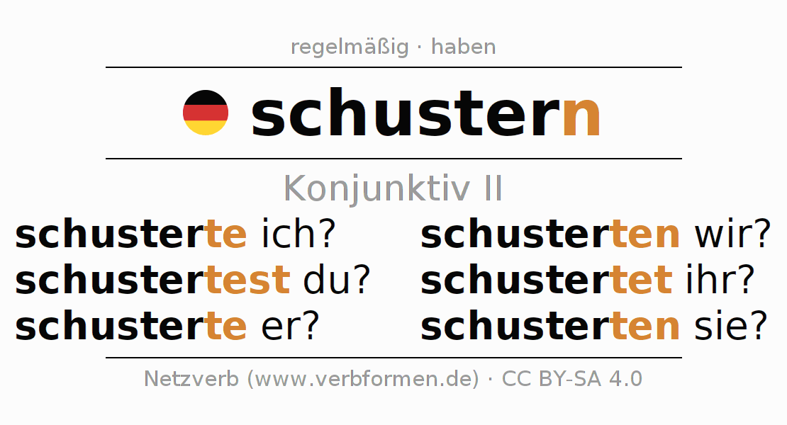 Die Konjugation von schustern im Konjunktiv Präteritum Möglichkeitsform Aktiv ist: schusterte ich?, schustertest du?, schusterte er?, schusterten wir?, schustertet ihr?, schusterten sie?.Die Bildung dieser Formen entspricht gewissen grammatischen Regeln. So auch die Vorgaben zur Konjugation der einfachen Verbformen von schustern im Konjunktiv II. Kommentare ☆