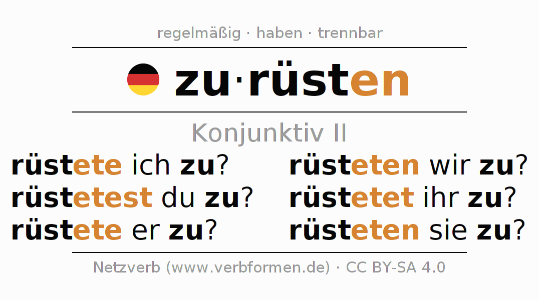 Die Konjugation von zurüsten im Konjunktiv Präteritum Möglichkeitsform Aktiv ist: rüstete ich zu?, rüstetest du zu?, rüstete er zu?, rüsteten wir zu?, rüstetet ihr zu?, rüsteten sie zu?.Die Bildung dieser Formen entspricht gewissen grammatischen Regeln. So auch die Vorgaben zur Konjugation der einfachen Verbformen von zurüsten im Konjunktiv II. Kommentare ☆
