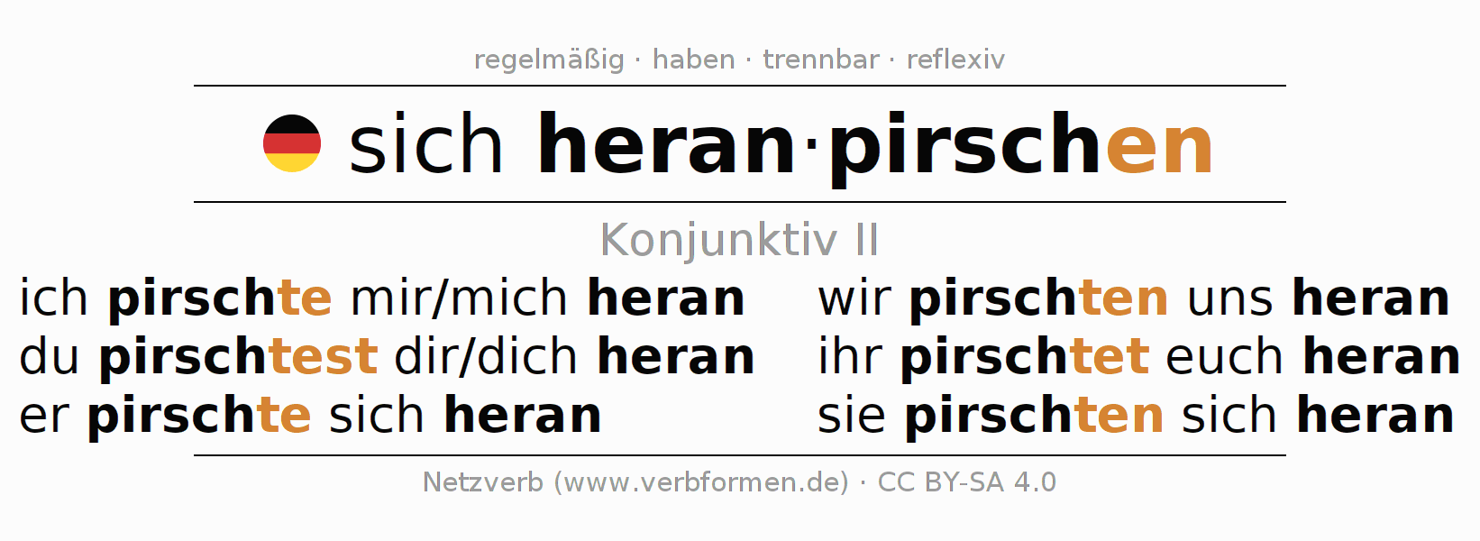 Das Verb sich heranpirschen vollständig in allen Personen und Numeri im Konjunktiv Präteritum konjugiert