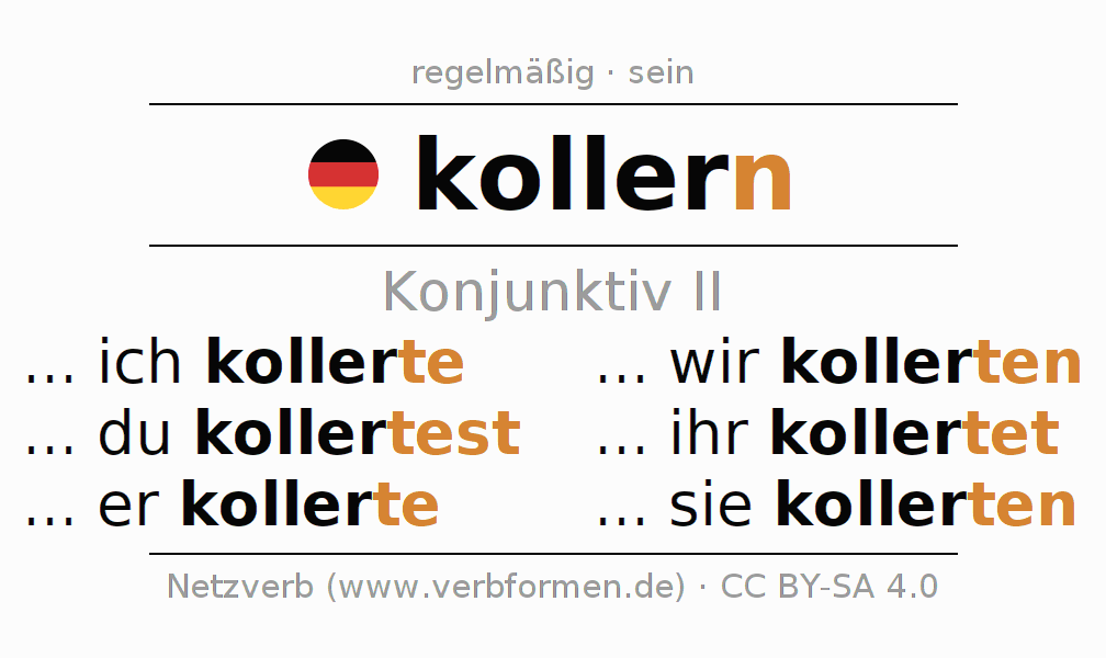 Die Konjugation von kollern im Konjunktiv Präteritum Möglichkeitsform Aktiv ist: ... ich kollerte, ... du kollertest, ... er kollerte, ... wir kollerten, ... ihr kollertet, ... sie kollerten.Die Bildung dieser Formen entspricht gewissen grammatischen Regeln. So auch die Vorgaben zur Konjugation der einfachen Verbformen von kollern im Konjunktiv II. Kommentare ☆
