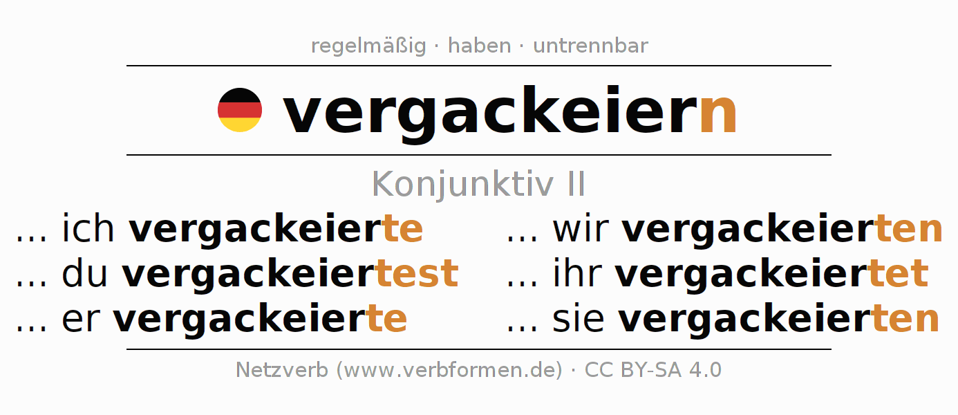 Das Verb vergackeiern vollständig in allen Personen und Numeri im Konjunktiv Präteritum konjugiert