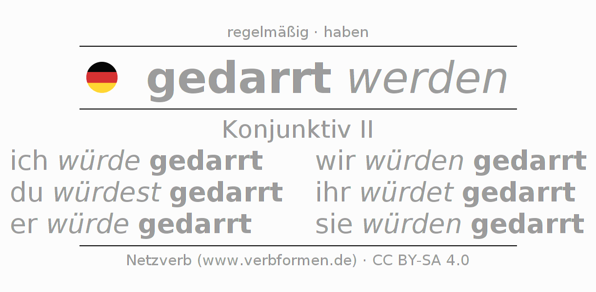 Die Konjugation von darren im Konjunktiv Präteritum Möglichkeitsform Vorgangspassiv ist: ich würde gedarrt, du würdest gedarrt, er würde gedarrt, wir würden gedarrt, ihr würdet gedarrt, sie würden gedarrt.Die Bildung dieser Formen entspricht gewissen grammatischen Regeln. So auch die Vorgaben zur Konjugation der einfachen Verbformen von darren im Konjunktiv II. Kommentare ☆