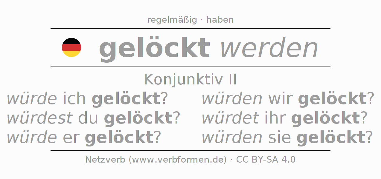 Die Konjugation von löcken im Konjunktiv Präteritum Möglichkeitsform Vorgangspassiv ist: würde ich gelöckt?, würdest du gelöckt?, würde er gelöckt?, würden wir gelöckt?, würdet ihr gelöckt?, würden sie gelöckt?.Die Bildung dieser Formen entspricht gewissen grammatischen Regeln. So auch die Vorgaben zur Konjugation der einfachen Verbformen von löcken im Konjunktiv II. Kommentare ☆