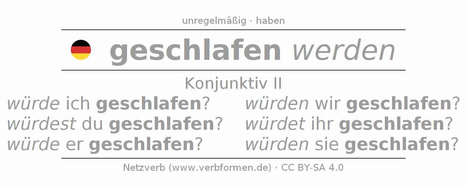 Die Konjugation von schlafen im Konjunktiv Präteritum Möglichkeitsform Vorgangspassiv ist: würde ich geschlafen?, würdest du geschlafen?, würde er geschlafen?, würden wir geschlafen?, würdet ihr geschlafen?, würden sie geschlafen?.Die Bildung dieser Formen entspricht gewissen grammatischen Regeln. So auch die Vorgaben zur Konjugation der einfachen Verbformen von schlafen im Konjunktiv II. 9Kommentare ☆5.0