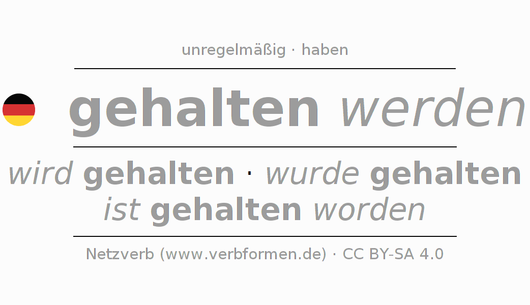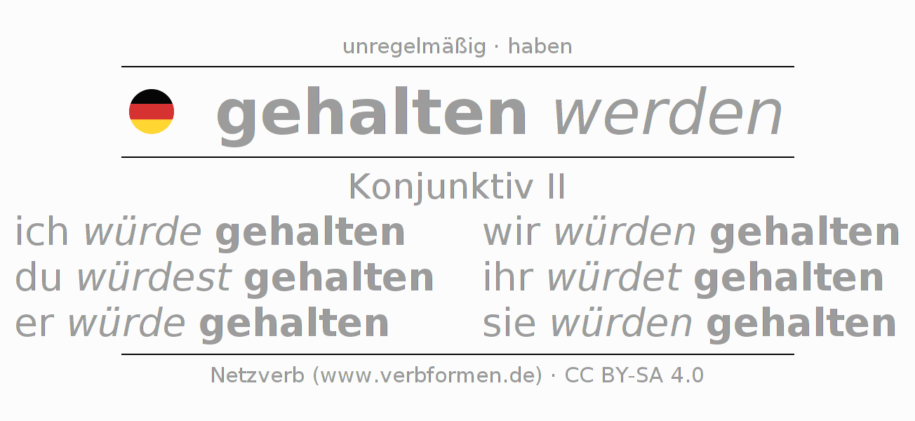 Die Konjugation von halten im Konjunktiv Präteritum Möglichkeitsform Vorgangspassiv ist: ich würde gehalten, du würdest gehalten, er würde gehalten, wir würden gehalten, ihr würdet gehalten, sie würden gehalten.Die Bildung dieser Formen entspricht gewissen grammatischen Regeln. So auch die Vorgaben zur Konjugation der einfachen Verbformen von halten im Konjunktiv II. 3Kommentare ☆4.5