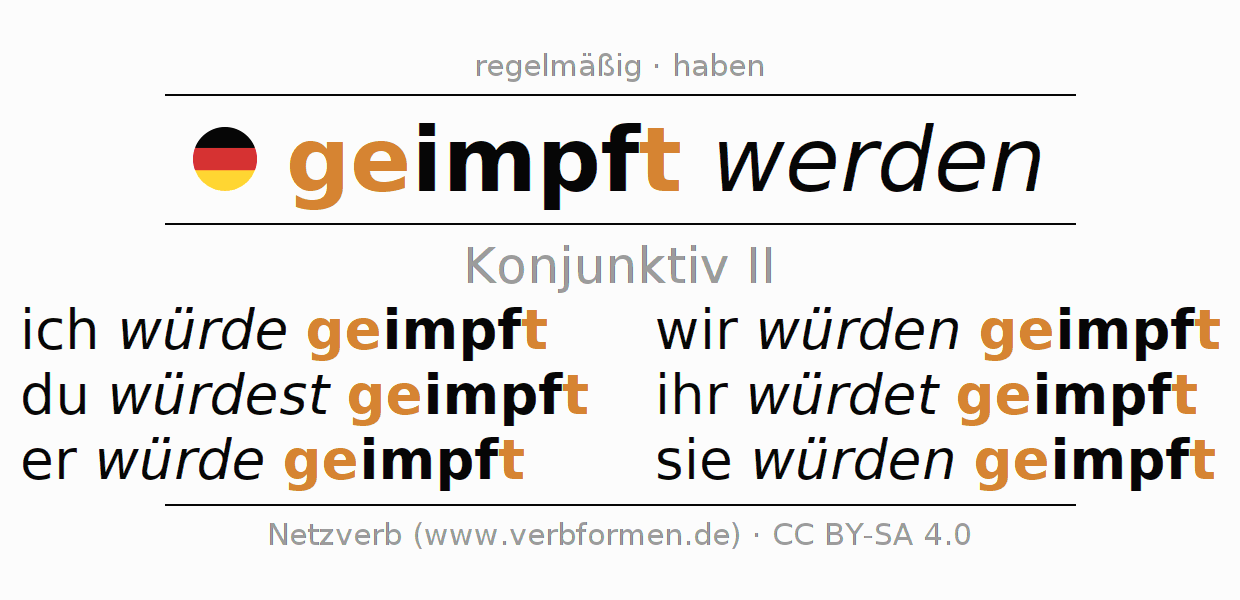 Die Konjugation von impfen im Konjunktiv Präteritum Möglichkeitsform Vorgangspassiv ist: ich würde geimpft, du würdest geimpft, er würde geimpft, wir würden geimpft, ihr würdet geimpft, sie würden geimpft.Die Bildung dieser Formen entspricht gewissen grammatischen Regeln. So auch die Vorgaben zur Konjugation der einfachen Verbformen von impfen im Konjunktiv II. Kommentare ☆