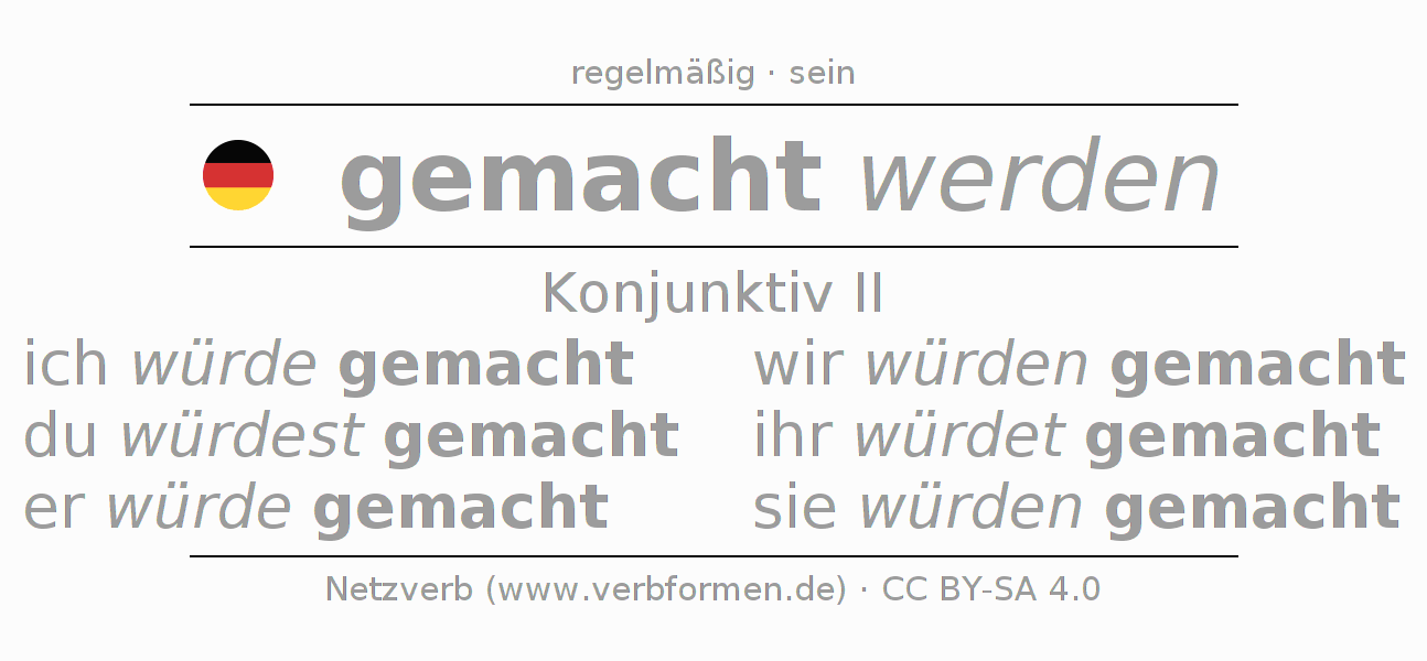 Die Konjugation von machen im Konjunktiv Präteritum Möglichkeitsform Vorgangspassiv ist: ich würde gemacht, du würdest gemacht, er würde gemacht, wir würden gemacht, ihr würdet gemacht, sie würden gemacht.Die Bildung dieser Formen entspricht gewissen grammatischen Regeln. So auch die Vorgaben zur Konjugation der einfachen Verbformen von machen im Konjunktiv II. 18Kommentare ☆5.0