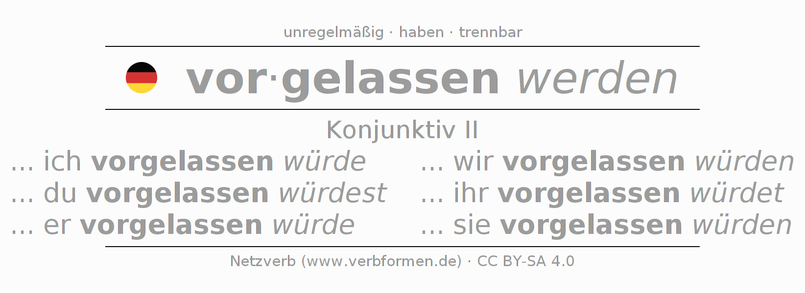 Die Konjugation von vorlassen im Konjunktiv Präteritum Möglichkeitsform Vorgangspassiv ist: ... ich vorgelassen würde, ... du vorgelassen würdest, ... er vorgelassen würde, ... wir vorgelassen würden, ... ihr vorgelassen würdet, ... sie vorgelassen würden.Die Bildung dieser Formen entspricht gewissen grammatischen Regeln. So auch die Vorgaben zur Konjugation der einfachen Verbformen von vorlassen im Konjunktiv II. Kommentare ☆