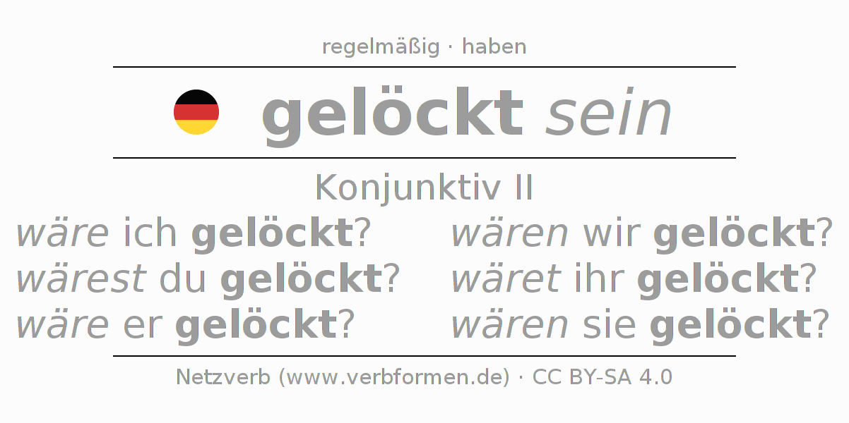 Die Konjugation von löcken im Konjunktiv Präteritum Möglichkeitsform Zustandspassiv ist: wäre ich gelöckt?, wärest du gelöckt?, wäre er gelöckt?, wären wir gelöckt?, wäret ihr gelöckt?, wären sie gelöckt?.Die Bildung dieser Formen entspricht gewissen grammatischen Regeln. So auch die Vorgaben zur Konjugation der einfachen Verbformen von löcken im Konjunktiv II. Kommentare ☆