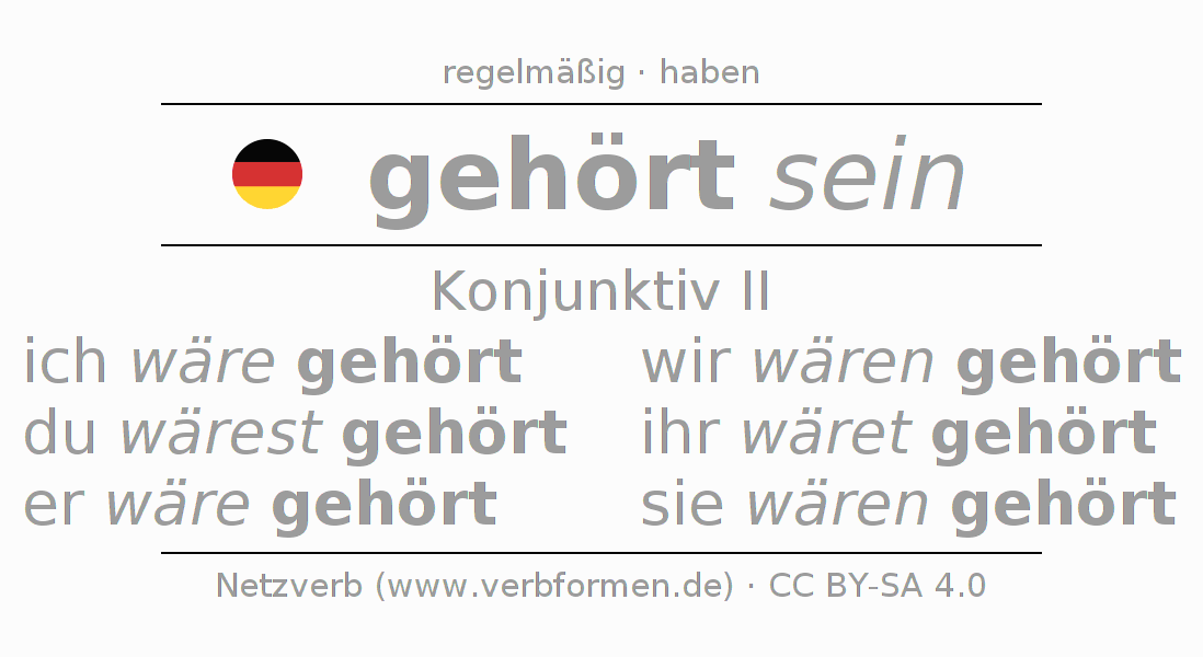 Die Konjugation von hören im Konjunktiv Präteritum Möglichkeitsform Zustandspassiv ist: ich wäre gehört, du wärest gehört, er wäre gehört, wir wären gehört, ihr wäret gehört, sie wären gehört.Die Bildung dieser Formen entspricht gewissen grammatischen Regeln. So auch die Vorgaben zur Konjugation der einfachen Verbformen von hören im Konjunktiv II. Kommentare ☆