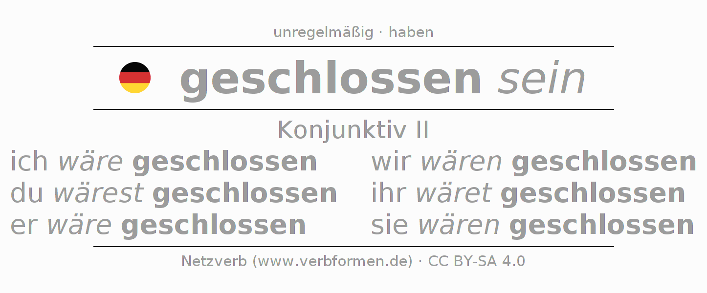 Die Konjugation von schließen im Konjunktiv Präteritum Möglichkeitsform Zustandspassiv ist: ich wäre geschlossen, du wärest geschlossen, er wäre geschlossen, wir wären geschlossen, ihr wäret geschlossen, sie wären geschlossen.Die Bildung dieser Formen entspricht gewissen grammatischen Regeln. So auch die Vorgaben zur Konjugation der einfachen Verbformen von schließen im Konjunktiv II. 1Kommentar ☆