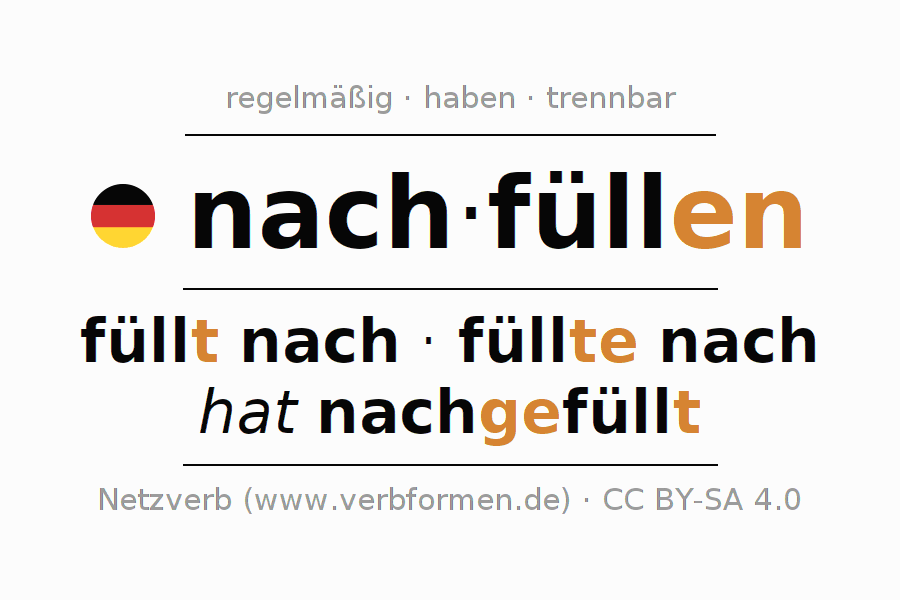 - Präsens: füll(e) (du) nach, füllen wir nach, füllt (ihr) nach, füllen Sie nach
