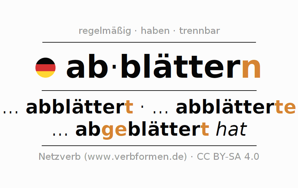 Die ab·blättern Konjugation online als Verbtabelle mit allen Verbformen in Singular (Einzahl) und Plural (Mehrzahl) in allen Personen (1. Person, 2.Person, 3. Person) übersichtlich dargestellt. Die Beugung bzw. Flexion des Verbs ab·blättern ist somit eine Hilfestellung für Hausaufgaben, Prüfungen, Klausuren, für den Deutschuntericht der Schule, zum Deutsch Lernen, für das Studium, Deutsch als Fremdsprache (DaZ), Deutsch als Zweitsprache (DaZ) und für die Erwachsenenbildung. Gerade auch für Deutschlernende ist die korrekte Konjugation des Verbs bzw. die korrekt flektierten Formen (... abblättert - ... abblätterte - ... abgeblättert hat) entscheidend. Weitere Informationen finden sich unter Wiktionary abblättern und unter abblättern im Duden.