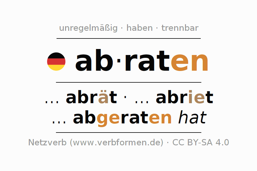 - Präsens: rat(e) (du) ab, raten wir ab, ratet (ihr) ab, raten Sie ab