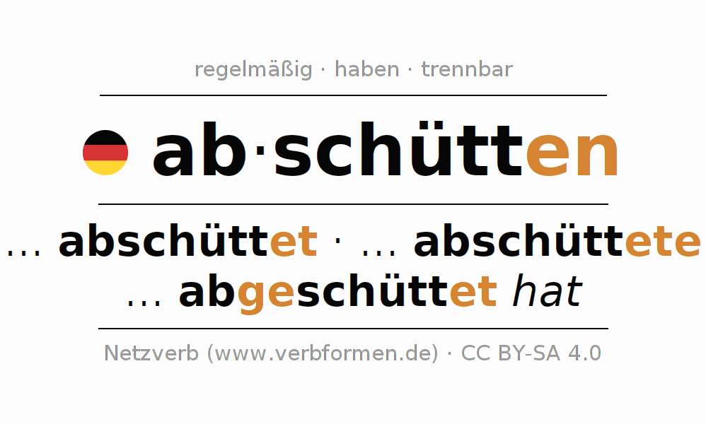 - Präsens: schütt(e) (du) ab, schütten wir ab, schüttet (ihr) ab, schütten Sie ab