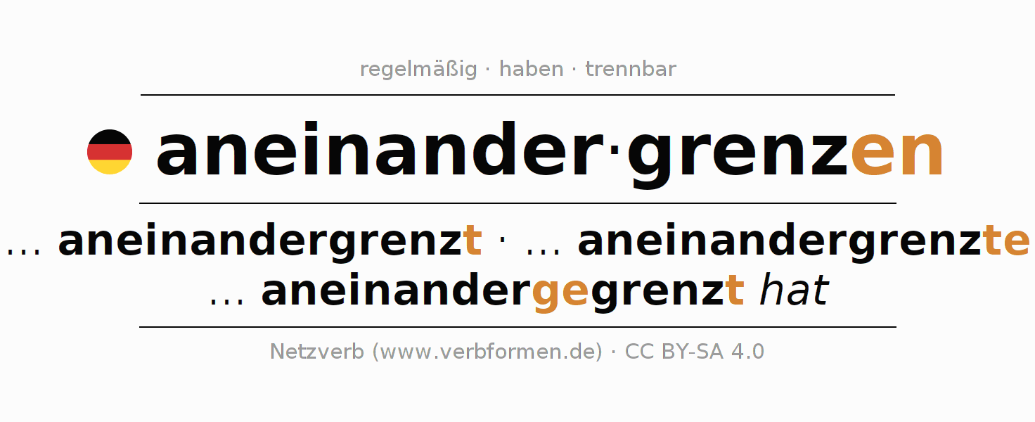 Die aneinander·grenzen Konjugation online als Verbtabelle mit allen Verbformen in Singular (Einzahl) und Plural (Mehrzahl) in allen Personen (1. Person, 2.Person, 3. Person) übersichtlich dargestellt. Die Beugung bzw. Flexion des Verbs aneinander·grenzen ist somit eine Hilfestellung für Hausaufgaben, Prüfungen, Klausuren, für den Deutschuntericht der Schule, zum Deutsch Lernen, für das Studium, Deutsch als Fremdsprache (DaZ), Deutsch als Zweitsprache (DaZ) und für die Erwachsenenbildung. Gerade auch für Deutschlernende ist die korrekte Konjugation des Verbs bzw. die korrekt flektierten Formen (... aneinandergrenzt - ... aneinandergrenzte - ... aneinandergegrenzt hat) entscheidend. Weitere Informationen finden sich unter Wiktionary aneinandergrenzen und unter aneinandergrenzen im Duden.