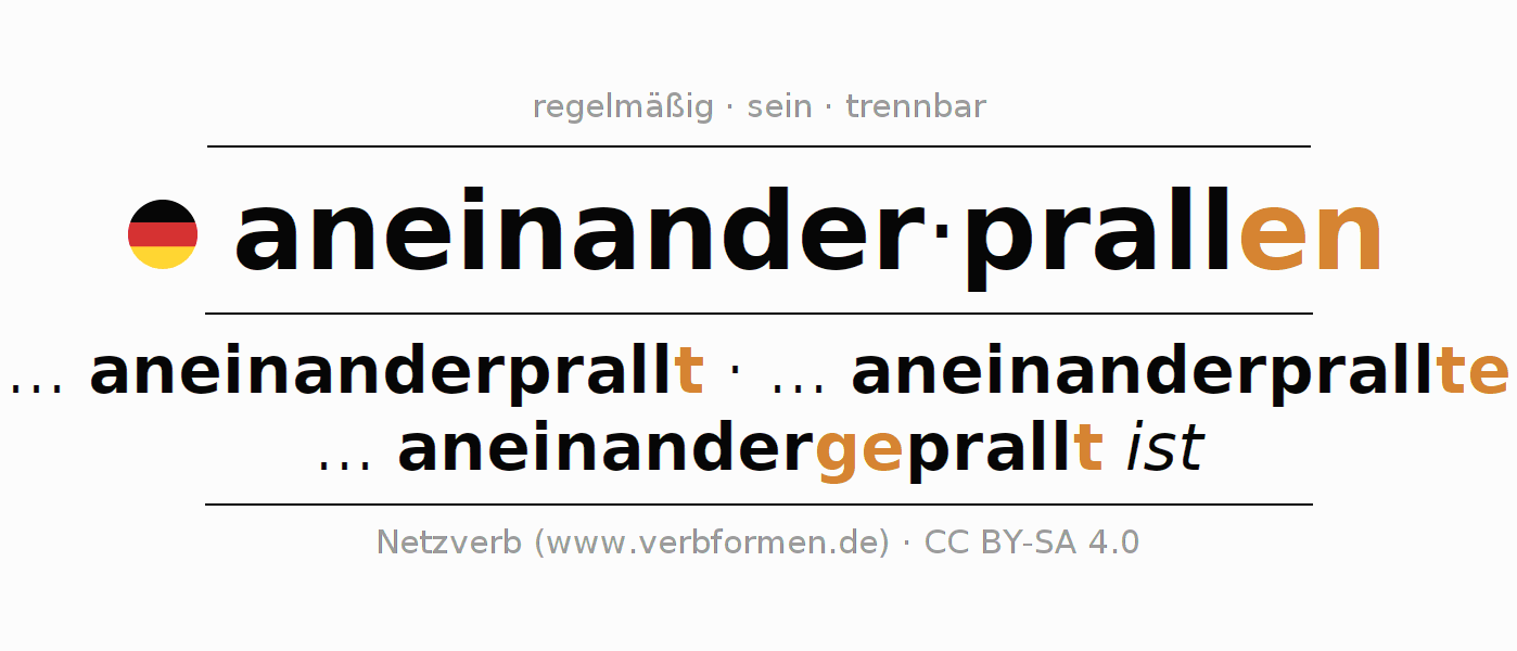 - Präsens: prall(e) (du) aneinander, prallen wir aneinander, prallt (ihr) aneinander, prallen Sie aneinander