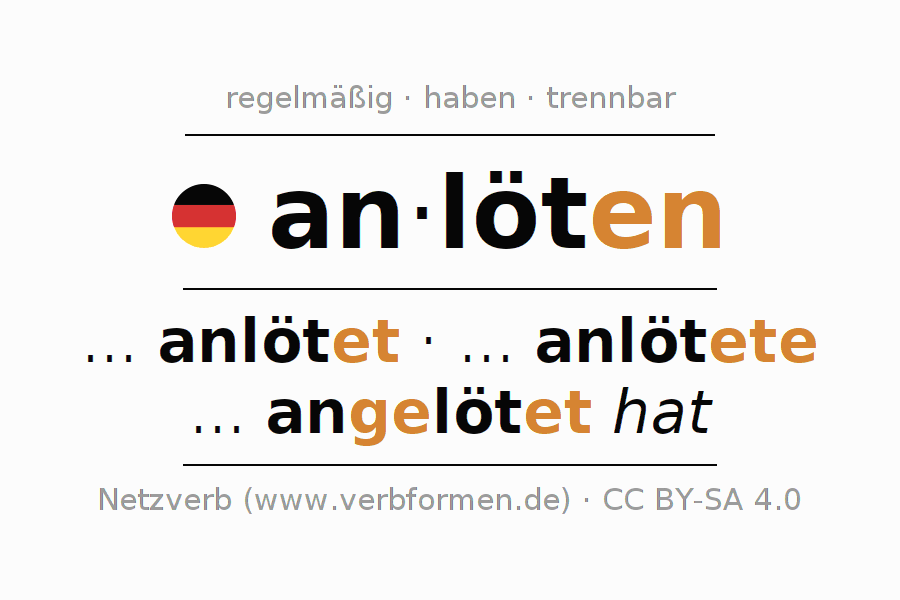 - Präsens: löt(e) (du) an, löten wir an, lötet (ihr) an, löten Sie an
