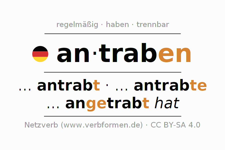 - Präsens: trab(e) (du) an, traben wir an, trabt (ihr) an, traben Sie an