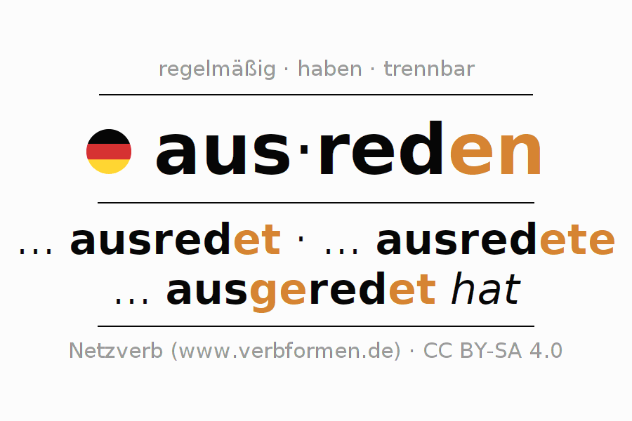 - Präsens: red(e) (du) aus, reden wir aus, redet (ihr) aus, reden Sie aus