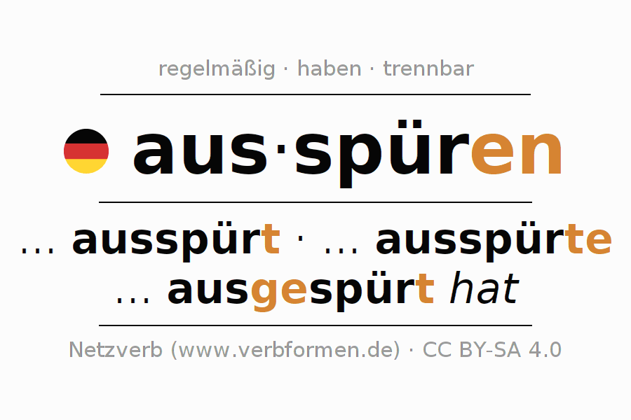 Das Verb ausspüren konjugiert im Indikativ Aktiv in den Zeitformen Gegenwart, Vergangenheit und Zukunft