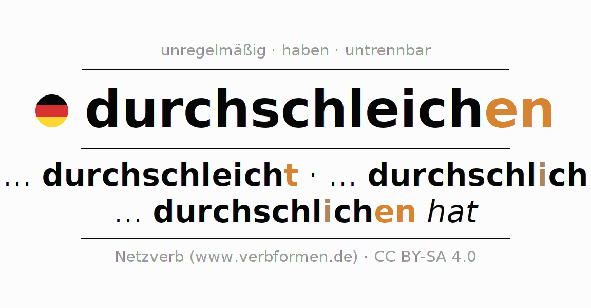 Die durchschleichen Konjugation online als Verbtabelle mit allen Verbformen in Singular (Einzahl) und Plural (Mehrzahl) in allen Personen (1. Person, 2.Person, 3. Person) übersichtlich dargestellt. Die Beugung bzw. Flexion des Verbs durchschleichen ist somit eine Hilfestellung für Hausaufgaben, Prüfungen, Klausuren, für den Deutschuntericht der Schule, zum Deutsch Lernen, für das Studium, Deutsch als Fremdsprache (DaZ), Deutsch als Zweitsprache (DaZ) und für die Erwachsenenbildung. Gerade auch für Deutschlernende ist die korrekte Konjugation des Verbs bzw. die korrekt flektierten Formen (... durchschleicht - ... durchschlich - ... durchschlichen hat) entscheidend. Weitere Informationen finden sich unter Wiktionary durchschleichen und unter durchschleichen im Duden.