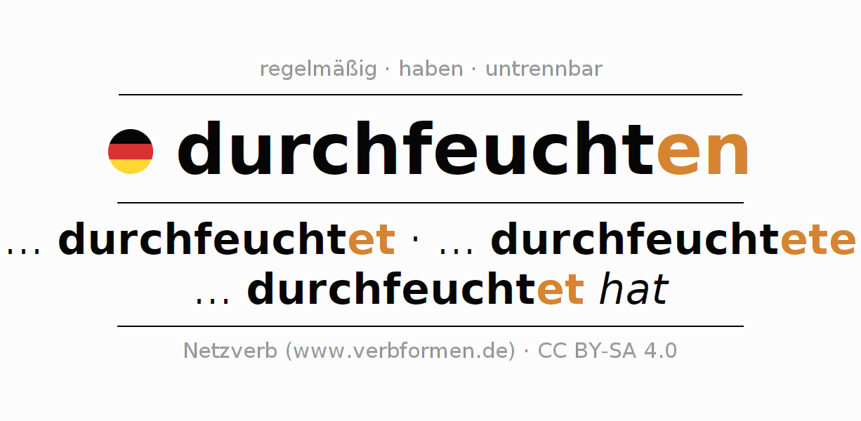 - Futur I: ... ich durchfeuchten werde, ... du durchfeuchten wirst, ... er durchfeuchten wird, ... wir durchfeuchten werden, ... ihr durchfeuchten werdet, ... sie durchfeuchten werden