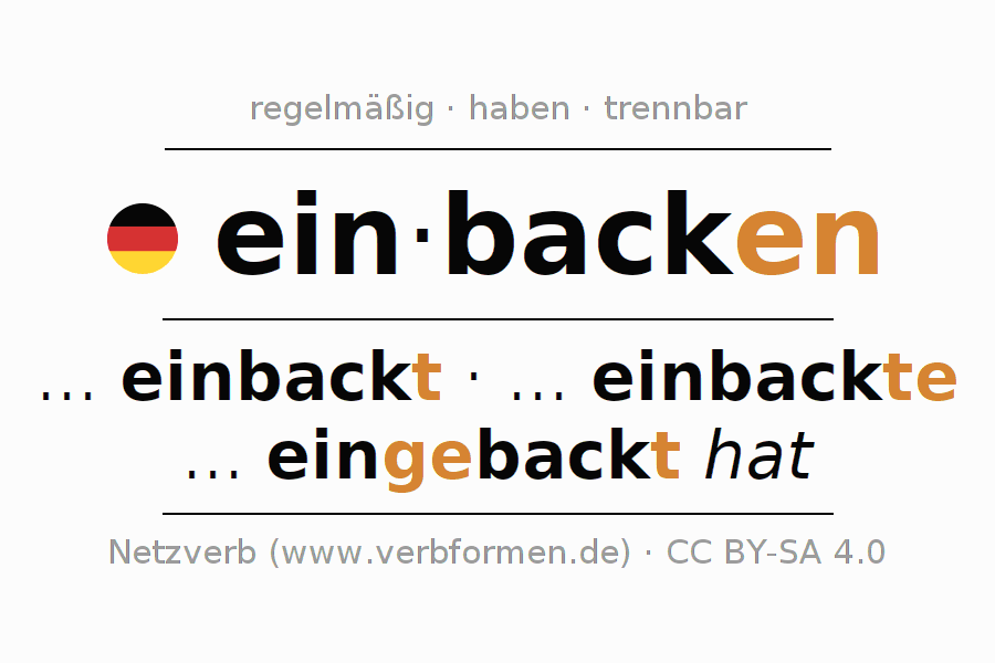 Das Konjugieren des Verbs einbacken erfolgt regelmäßig. Die Stammformen sind ... einbackt, ... einbackte und ... eingebackt hat. Daneben gibt es auch noch die unregelmäßige Konjugation. Als Hilfsverb von einbacken wird "haben" verwendet. Die Vorsilbe ein- von einbacken ist trennbar. Die Beugung erfolgt im Aktiv und die Darstellung als Nebensatz. Zum besseren Verständnis stehen unzählige Beispiele für das Verb einbacken zur Verfügung. Zum Üben und Festigen gibt es außerdem kostenlose Arbeitsblätter für einbacken. Man kann nicht nur einbacken konjugieren, sondern alle deutschen Verben. Kommentare ☆