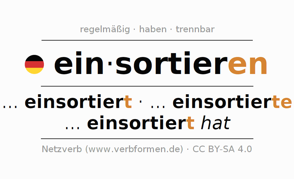 - Präsens: sortier(e) (du) ein, sortieren wir ein, sortiert (ihr) ein, sortieren Sie ein
