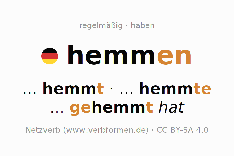 - Präsens: hemm(e) (du), hemmen wir, hemmt (ihr), hemmen Sie