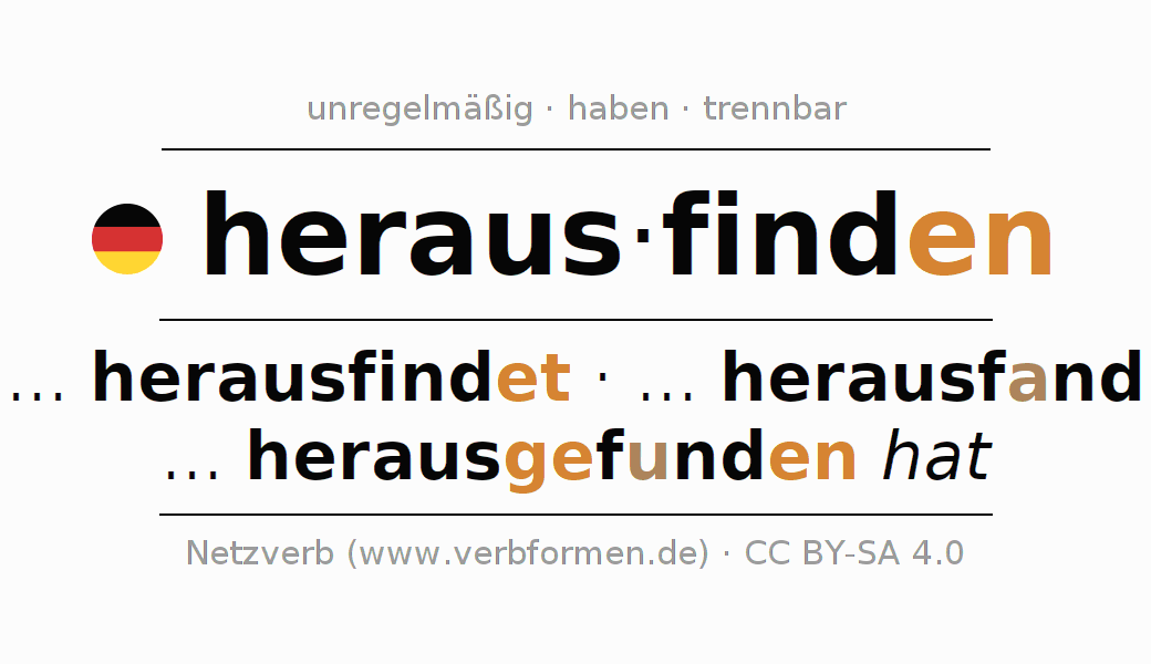 - Präsens: find(e) (du) heraus, finden wir heraus, findet (ihr) heraus, finden Sie heraus
