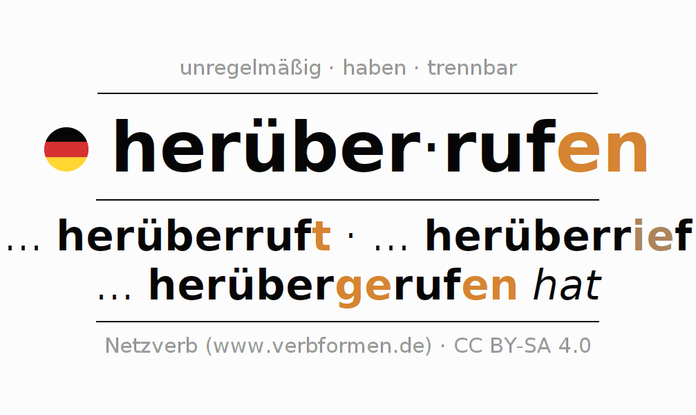 - Präsens: ruf(e) (du) herüber, rufen wir herüber, ruft (ihr) herüber, rufen Sie herüber