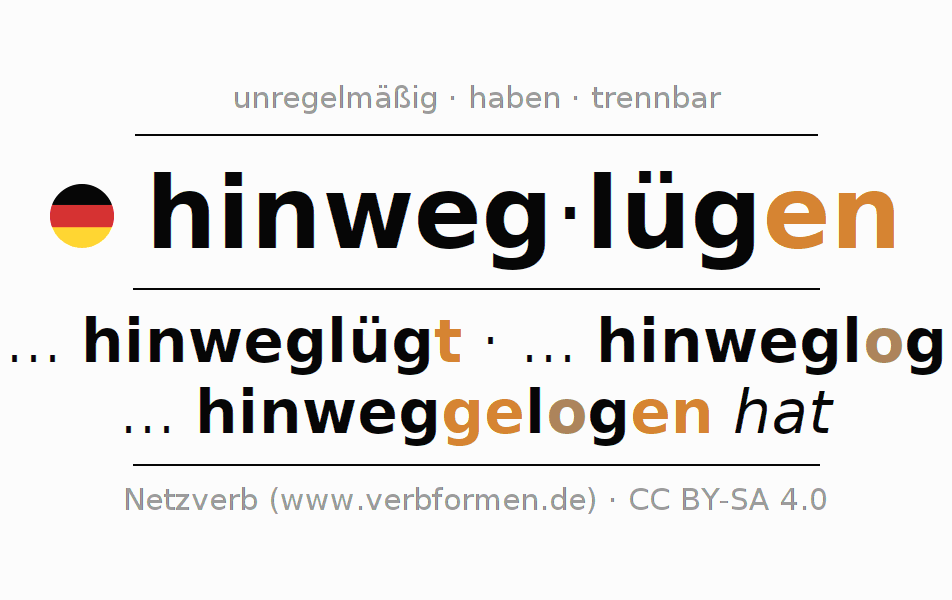 - Präsens: lüg(e) (du) hinweg, lügen wir hinweg, lügt (ihr) hinweg, lügen Sie hinweg