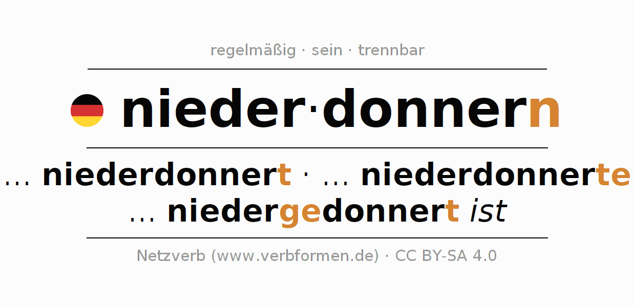 - Perfekt: ... ich niedergedonnert bin, ... du niedergedonnert bist, ... er niedergedonnert ist, ... wir niedergedonnert sind, ... ihr niedergedonnert seid, ... sie niedergedonnert sind