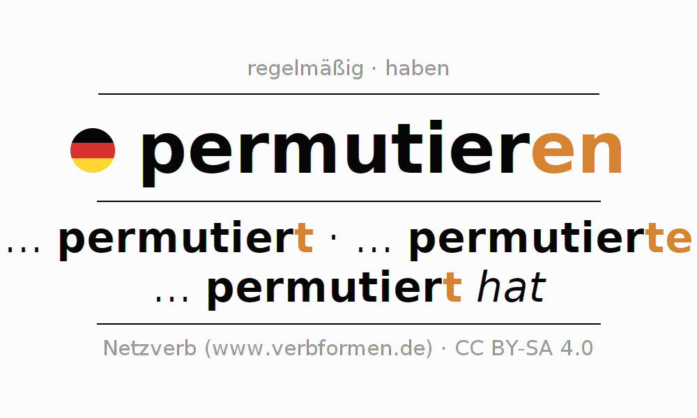 - Perfekt: ... ich permutiert habe, ... du permutiert hast, ... er permutiert hat, ... wir permutiert haben, ... ihr permutiert habt, ... sie permutiert haben