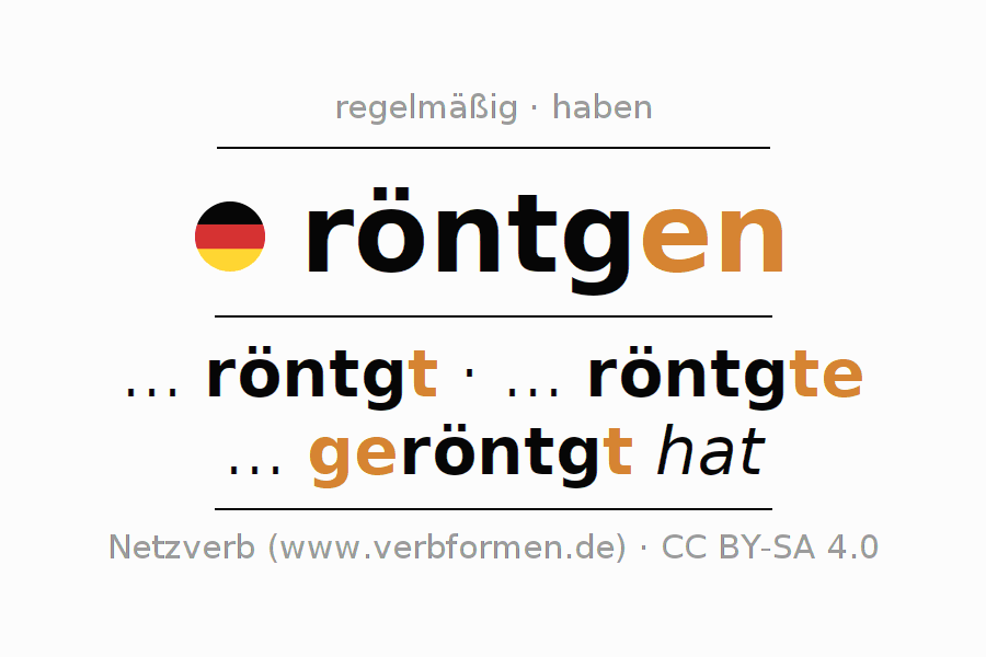 - Perfekt: ... ich geröntgt habe, ... du geröntgt hast, ... er geröntgt hat, ... wir geröntgt haben, ... ihr geröntgt habt, ... sie geröntgt haben