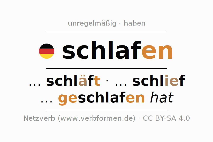- Präsens: schlaf(e) (du), schlafen wir, schlaft (ihr), schlafen Sie