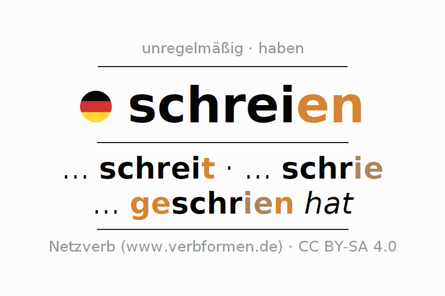 - Präsens: schrei(e) (du), schrei(e)n wir, schreit (ihr), schrei(e)n Sie