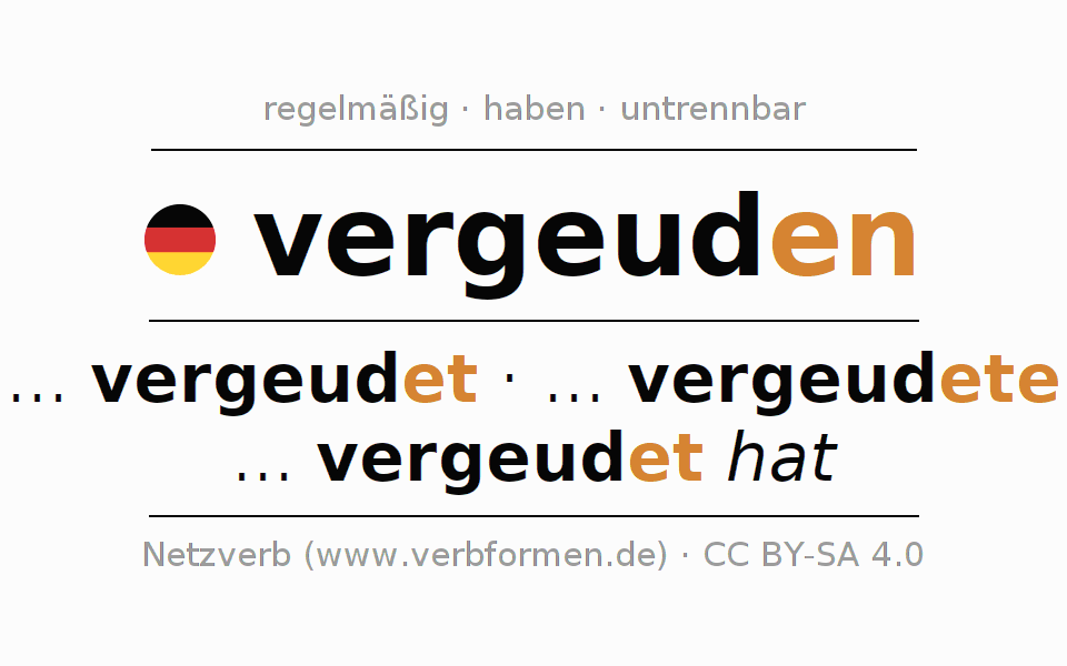 - Präsens: vergeud(e) (du), vergeuden wir, vergeudet (ihr), vergeuden Sie