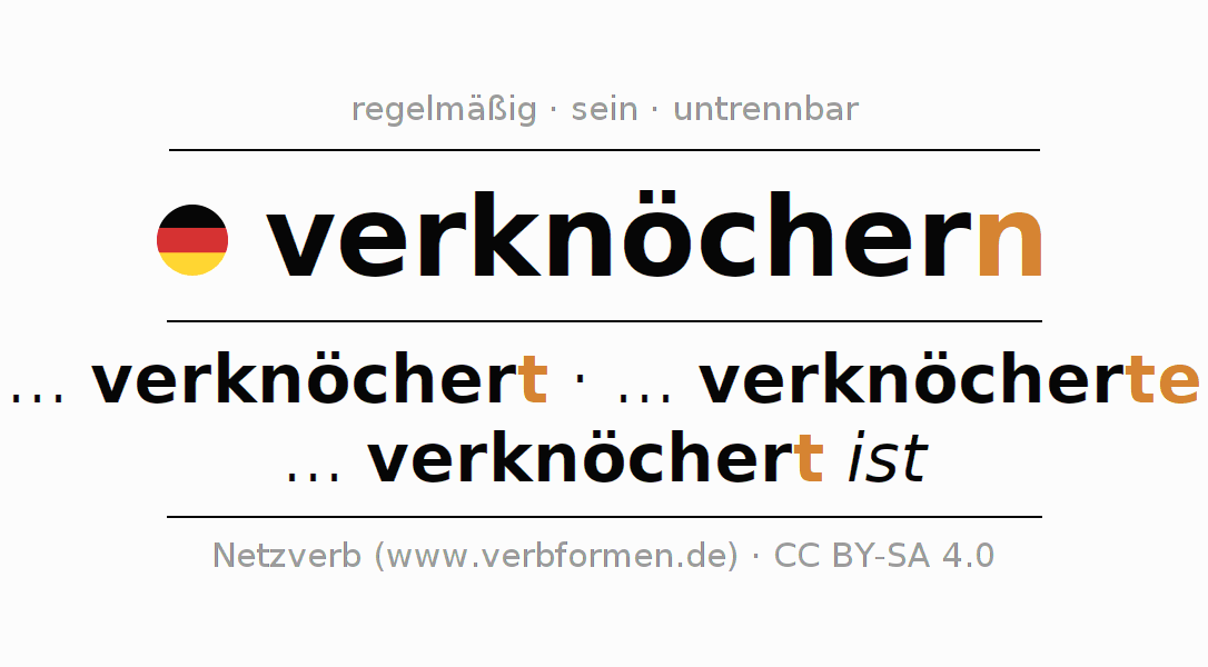 Das Verb verknöchern konjugiert im Indikativ Aktiv in den Zeitformen Gegenwart, Vergangenheit und Zukunft