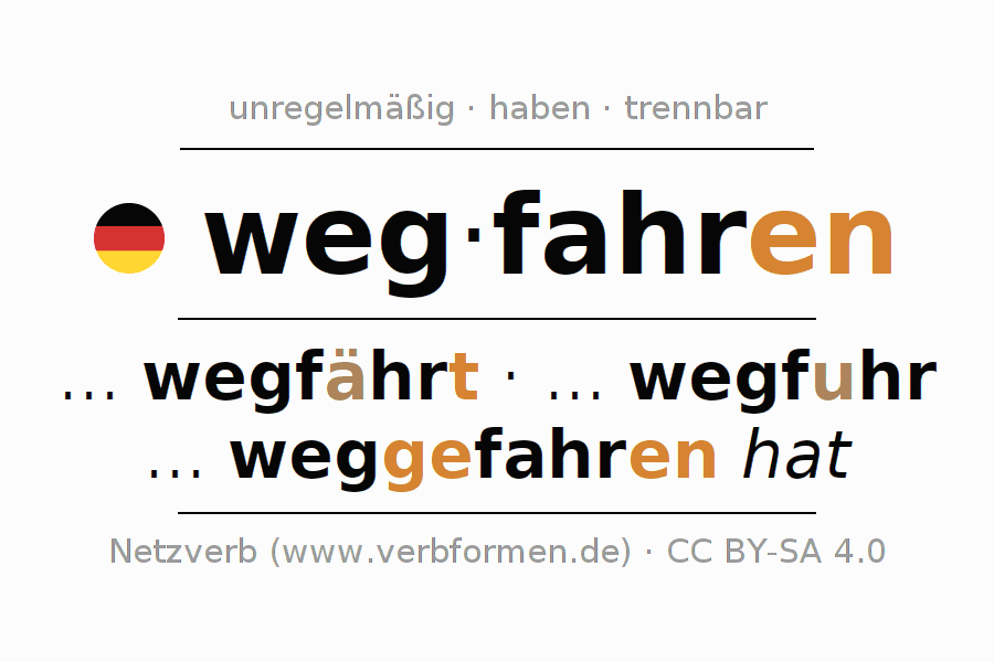 Die weg·fahren Konjugation online als Verbtabelle mit allen Verbformen in Singular (Einzahl) und Plural (Mehrzahl) in allen Personen (1. Person, 2.Person, 3. Person) übersichtlich dargestellt. Die Beugung bzw. Flexion des Verbs weg·fahren ist somit eine Hilfestellung für Hausaufgaben, Prüfungen, Klausuren, für den Deutschuntericht der Schule, zum Deutsch Lernen, für das Studium, Deutsch als Fremdsprache (DaZ), Deutsch als Zweitsprache (DaZ) und für die Erwachsenenbildung. Gerade auch für Deutschlernende ist die korrekte Konjugation des Verbs bzw. die korrekt flektierten Formen (... wegfährt - ... wegfuhr - ... weggefahren hat) entscheidend. Weitere Informationen finden sich unter Wiktionary wegfahren und unter wegfahren im Duden.