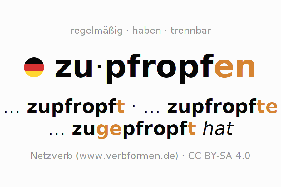 - Futur I: ... ich zupfropfen werde, ... du zupfropfen wirst, ... er zupfropfen wird, ... wir zupfropfen werden, ... ihr zupfropfen werdet, ... sie zupfropfen werden