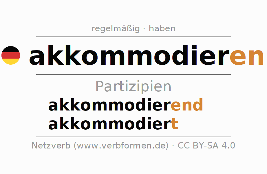 Das Verb akkommodieren vollständig in allen Personen und Numeri im Partizip Präsens Perfekt konjugiert