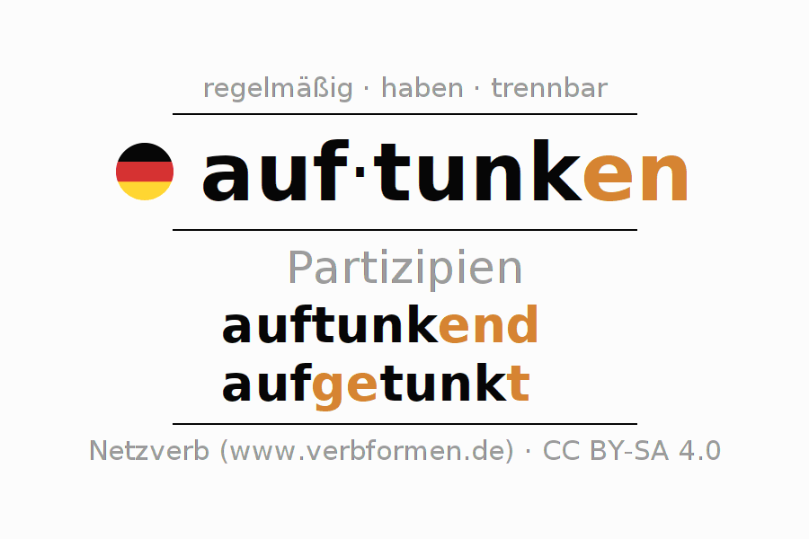 Das Verb auftunken vollständig in allen Personen und Numeri im Partizip Präsens Perfekt konjugiert