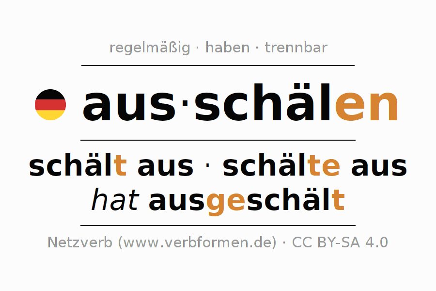 Das Verb ausschälen vollständig in allen Personen und Numeri im Partizip Präsens Perfekt konjugiert