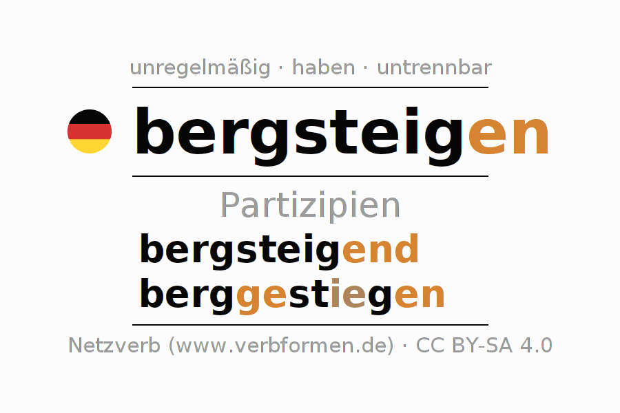 Das Verb bergsteigen vollständig in allen Personen und Numeri im Partizip Präsens Perfekt konjugiert