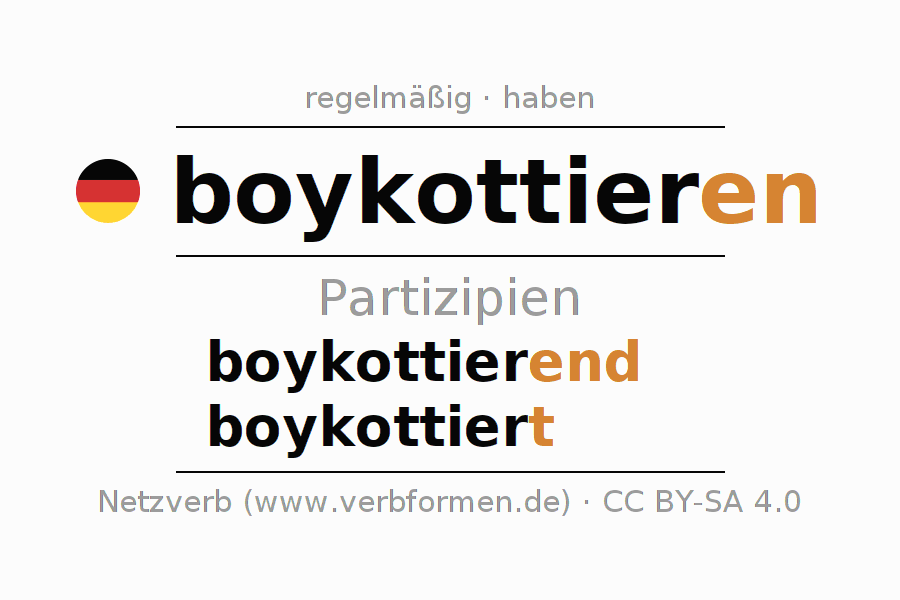 Das Verb boykottieren vollständig in allen Personen und Numeri im Partizip Präsens Perfekt konjugiert