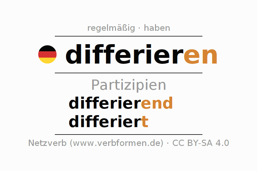 Das Verb differieren vollständig in allen Personen und Numeri im Partizip Präsens Perfekt konjugiert