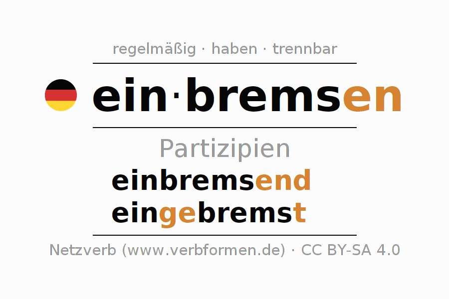 Das Verb einbremsen vollständig in allen Personen und Numeri im Partizip Präsens Perfekt konjugiert