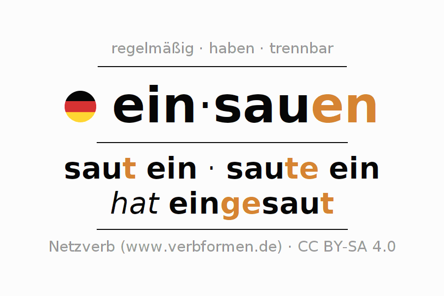 Das Verb einsauen vollständig in allen Personen und Numeri im Partizip Präsens Perfekt konjugiert